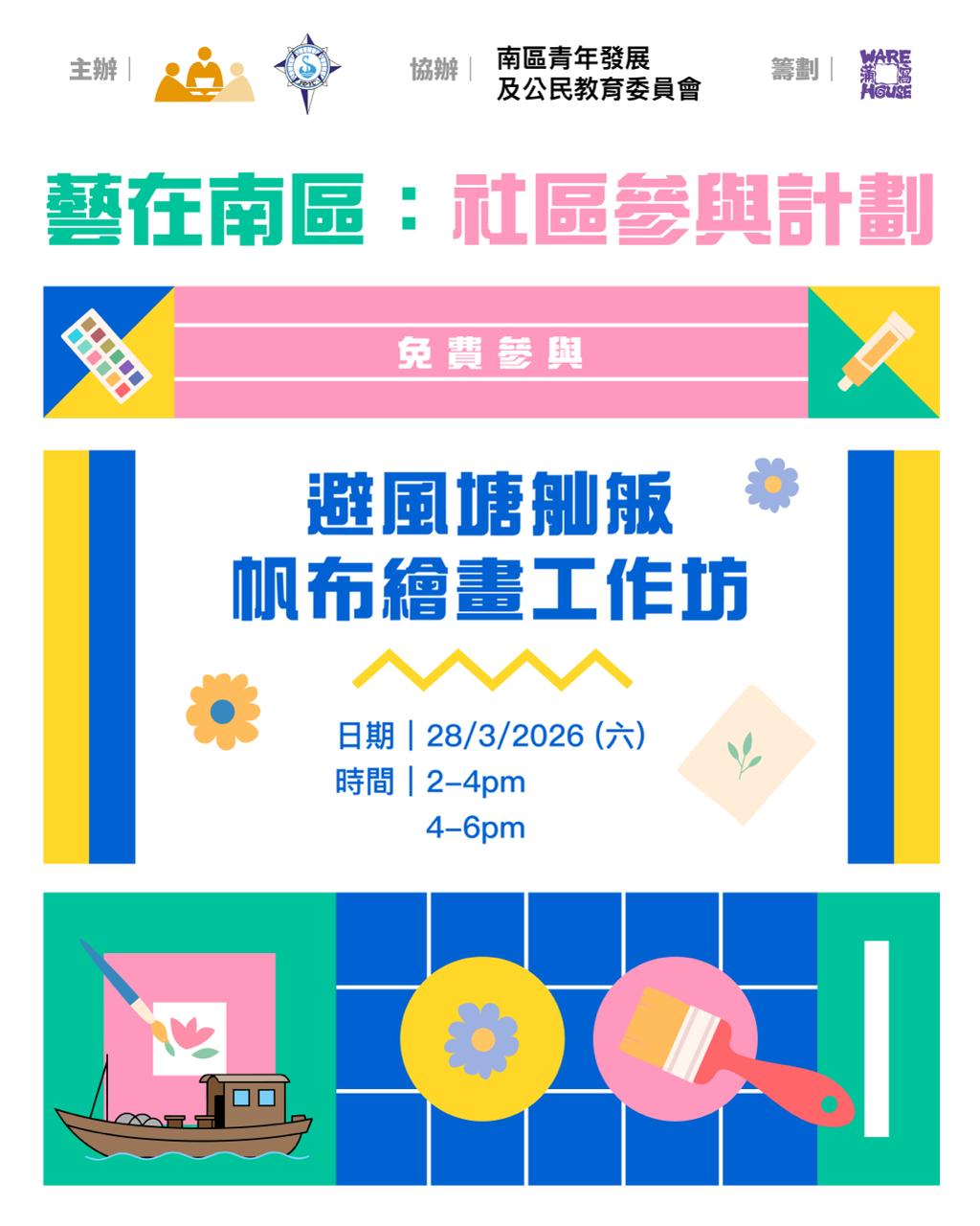 【3月】避風塘舢舨帆布繪畫工作坊 2026-03-25 作者 Karis Ip 由年輕藝術家帶領大家共創!以充滿歷史色彩的避風塘文化為主題,合力為 3 艘傳統舢舨的帆布船篷畫上新裝,作品將於 … 閱讀更多
